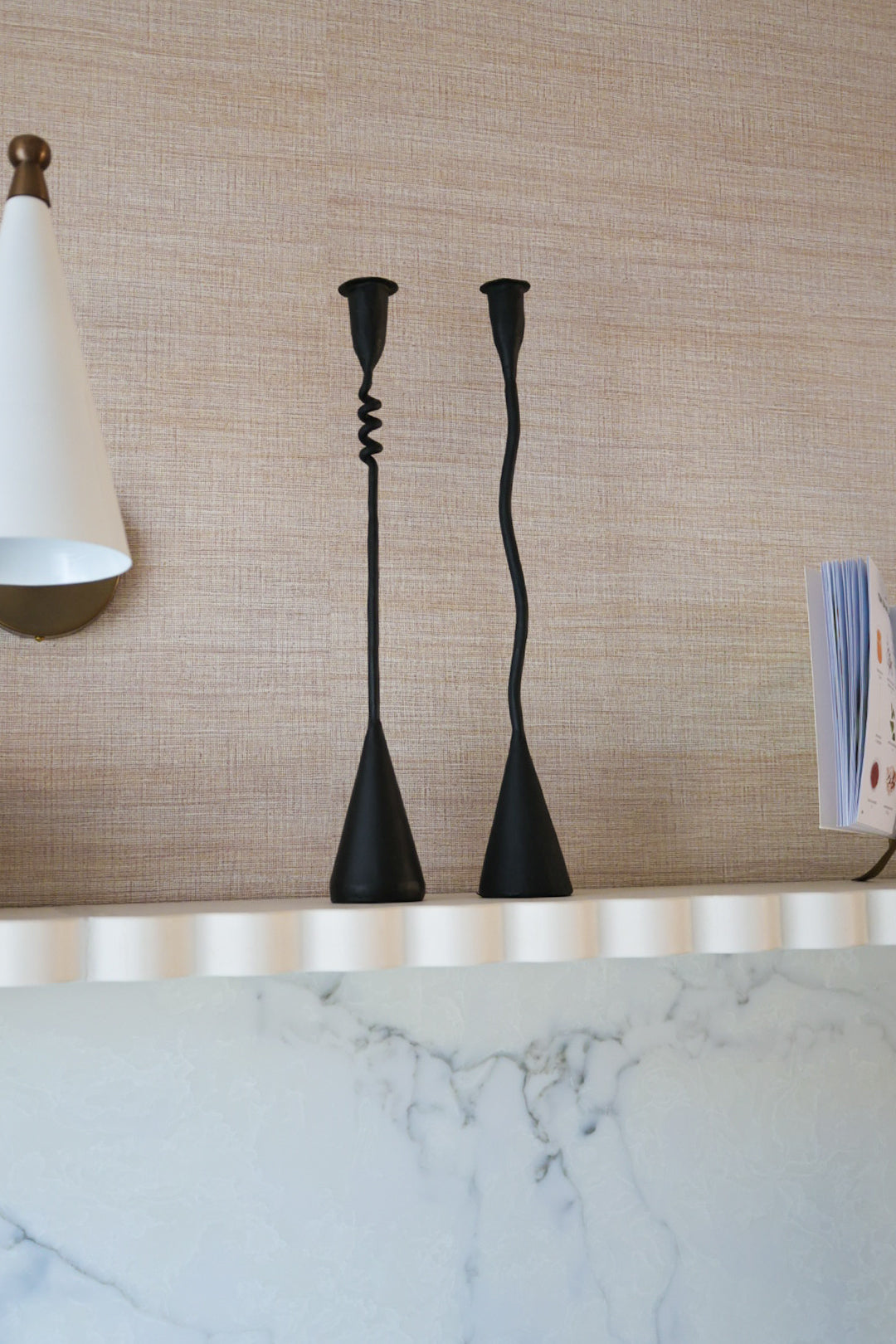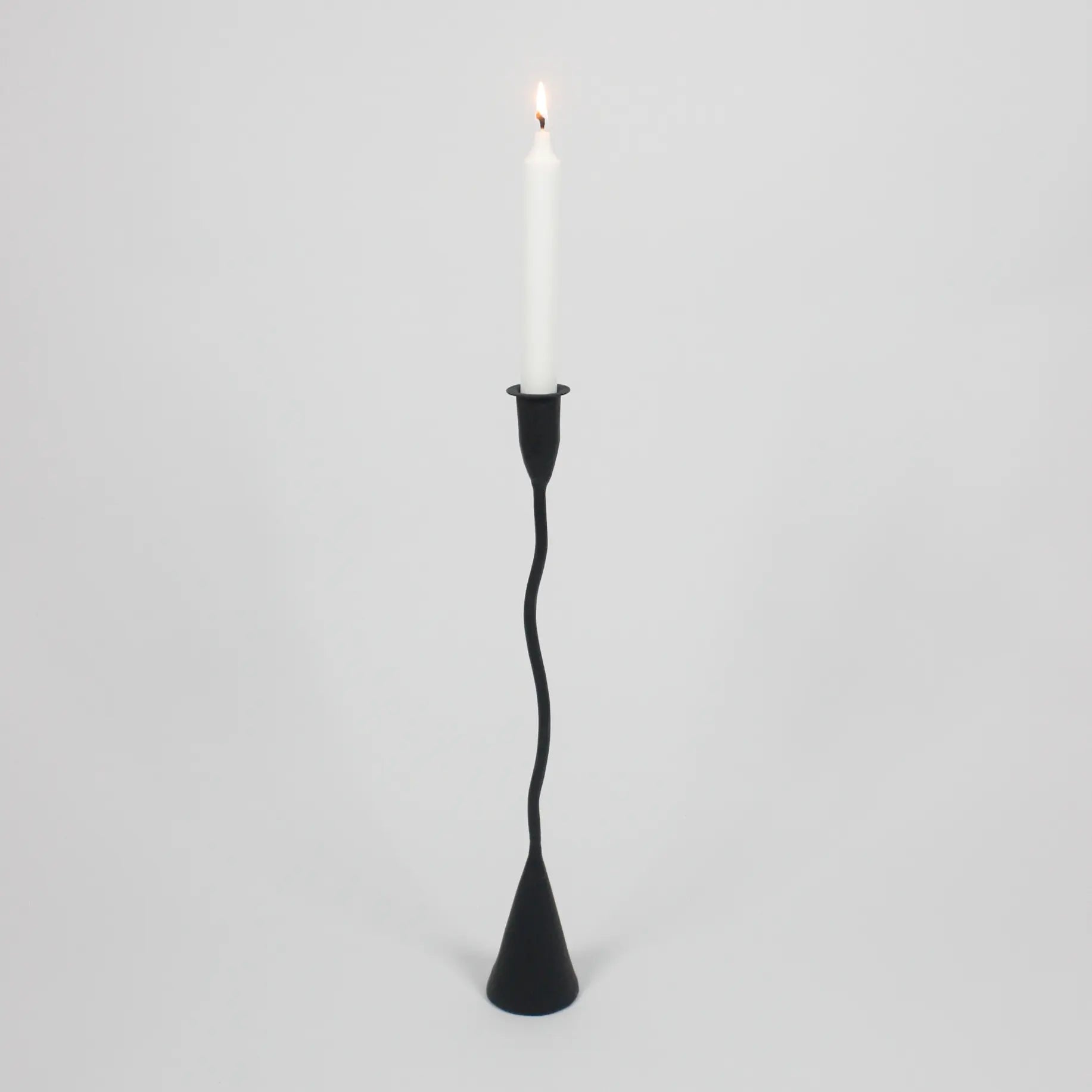 Kandelaar van ijzer die met zijn rondingen een vleugje moderne elegantie toevoegt.